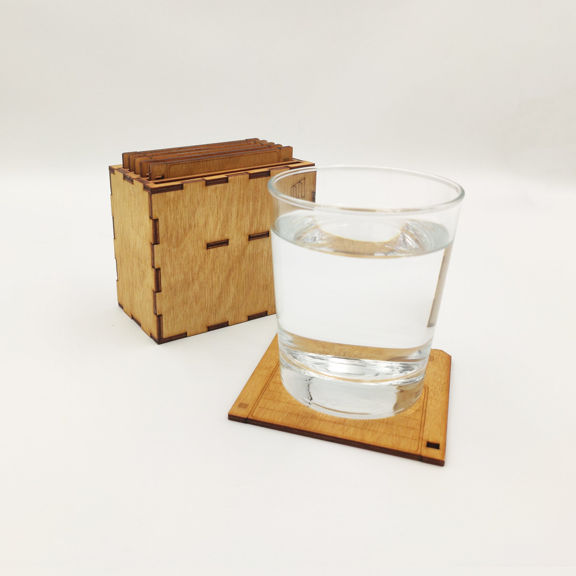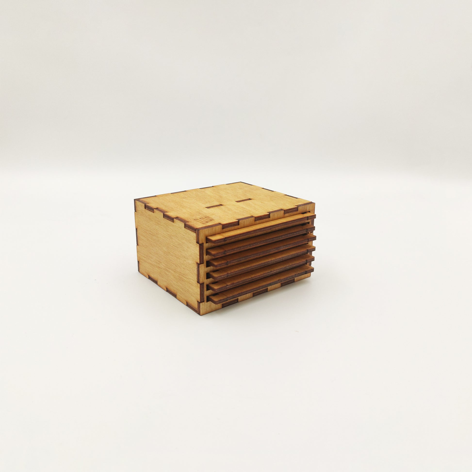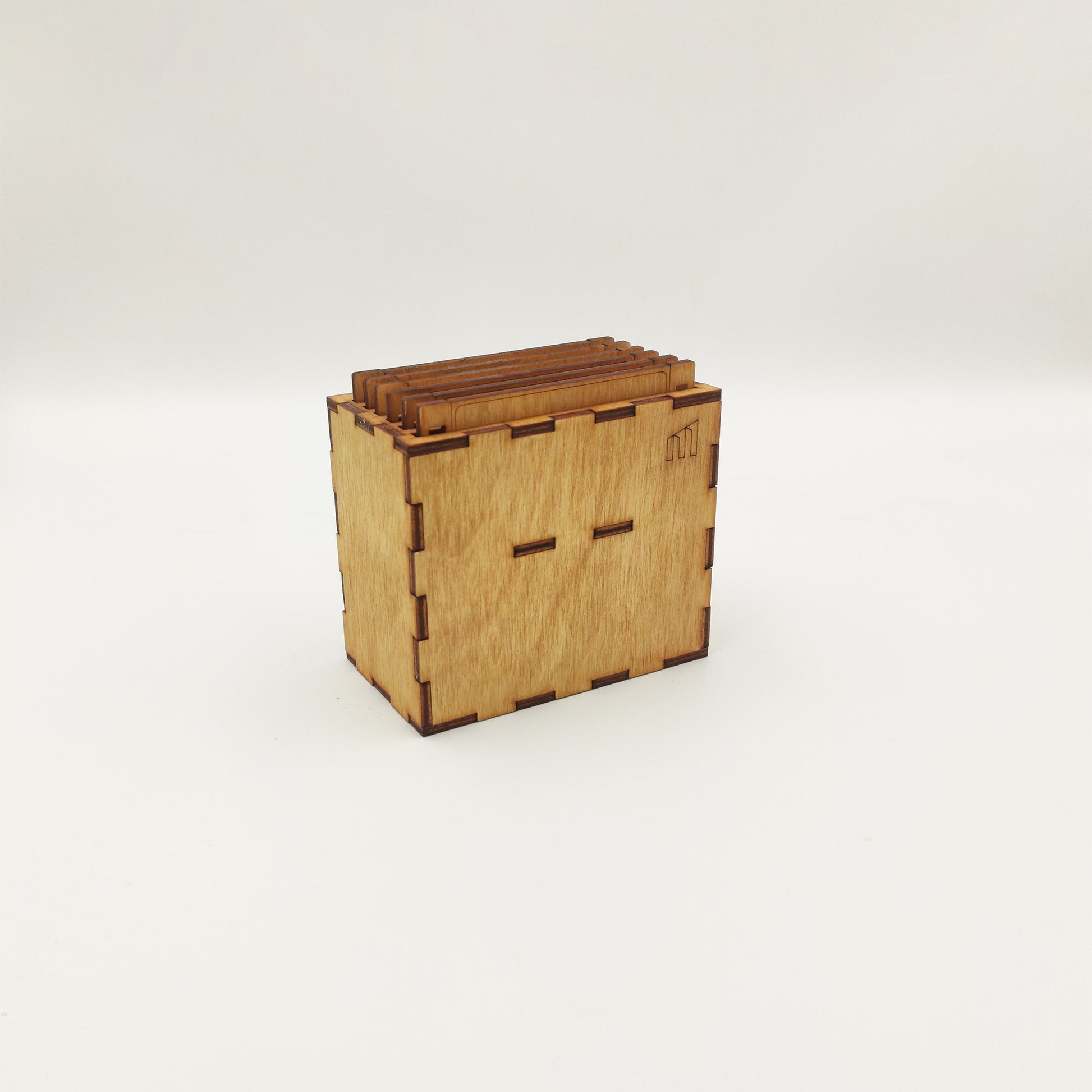 Το σετ συνοδεύεται από ξύλινη βάση αποθήκευσης, επίσης κομμένη και χαραγμένη στο laser, βαμμένη στο ίδιο χρώμα και σχεδιασμένη ώστε να στέκεται είτε όρθια είτε στο πλάι. Ένα functional αλλά και διακοσμητικό κομμάτι που ολοκληρώνει το σύνολο με minimal, geeky αισθητική.