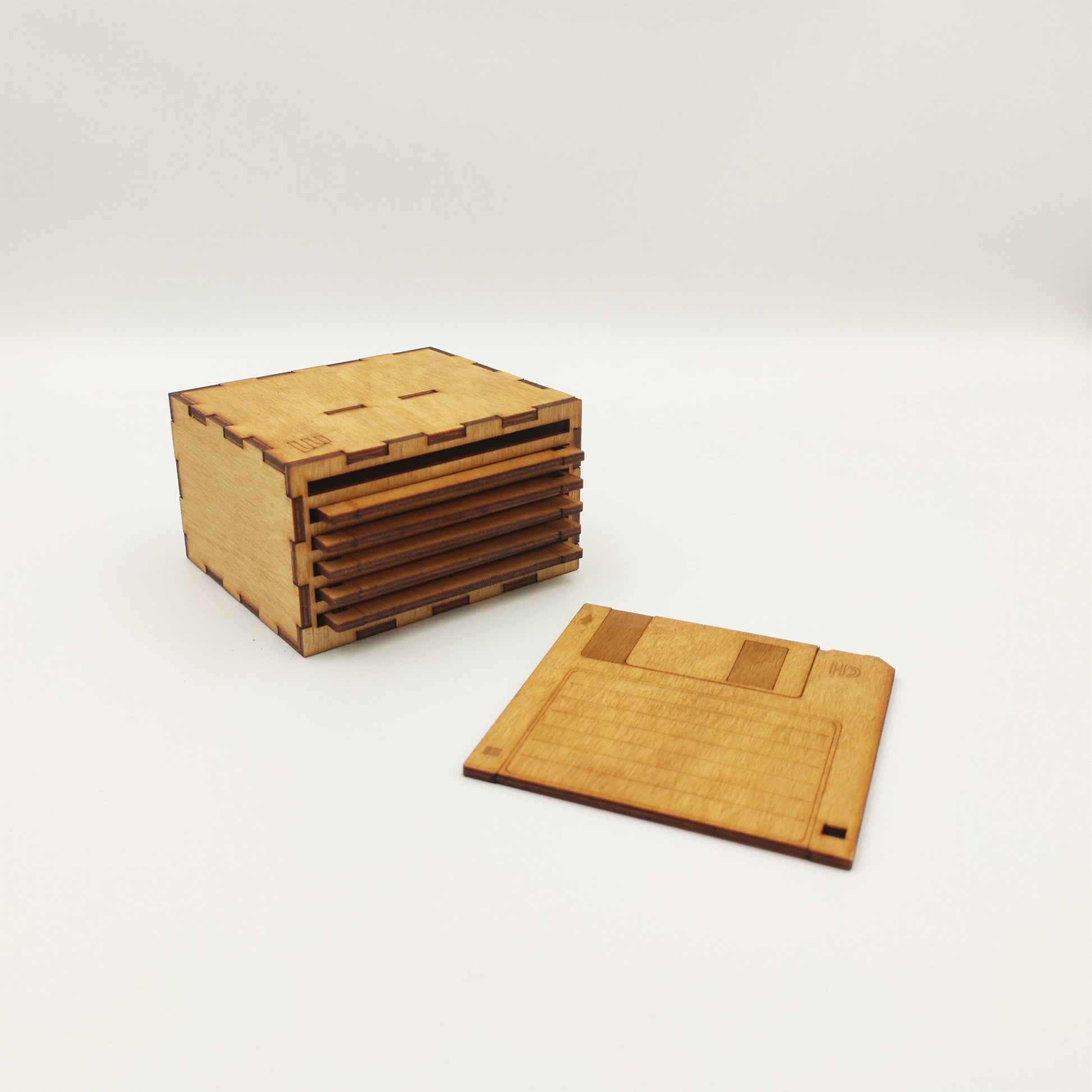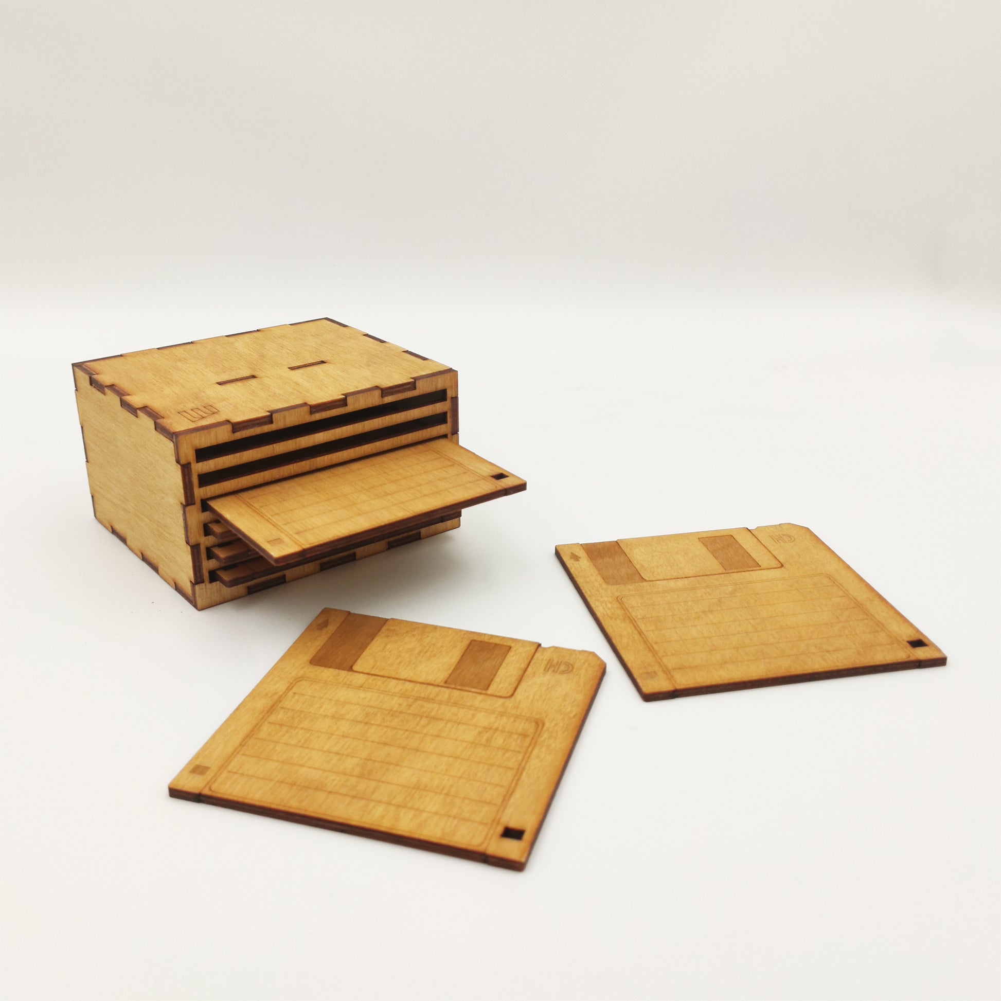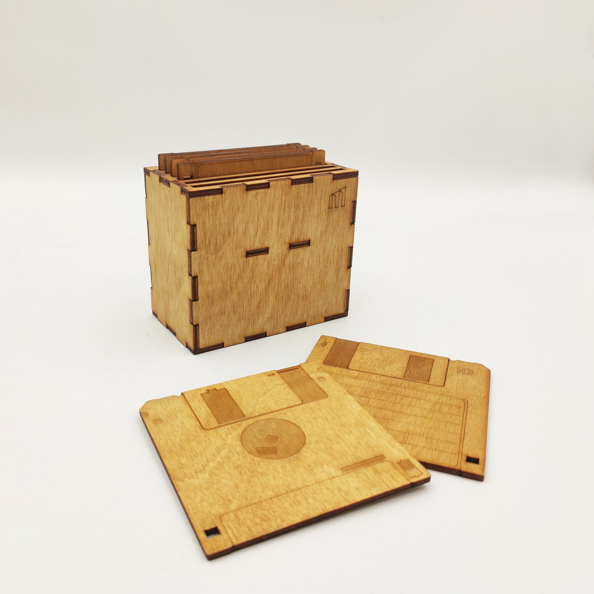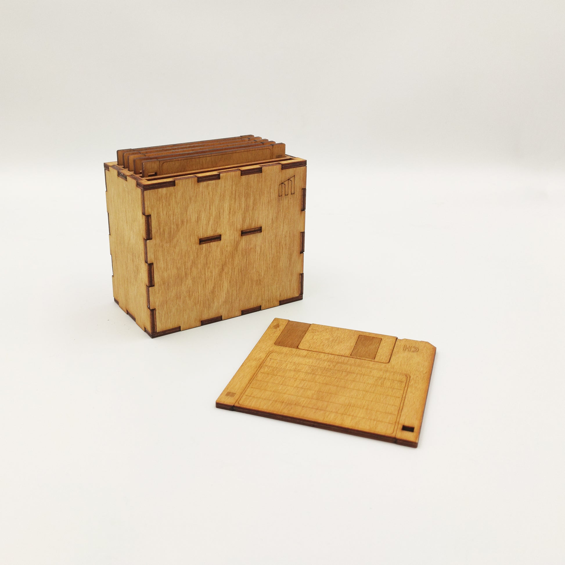 Κάθε σουβέρ είναι κατασκευασμένο από ξύλο, με κοπή και χάραξη laser που αποδίδει με ακρίβεια όλες τις λεπτομέρειες του αυθεντικού floppy: από το label και το πλαίσιο μέχρι τις χαρακτηριστικές γωνίες του. Το φινίρισμα γίνεται στο χέρι, με βερνίκι χρώματος Δρυς, που αναδεικνύει τη φυσική υφή του ξύλου και προσθέτει ζεστασιά στο αποτέλεσμα.
