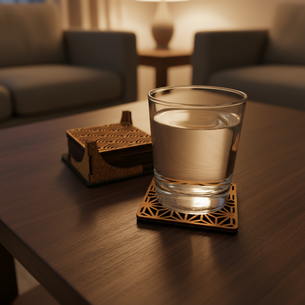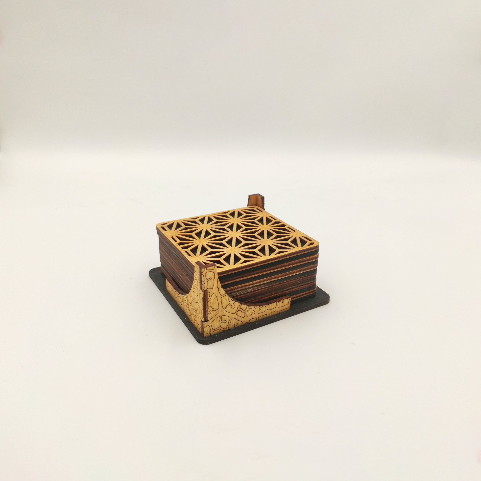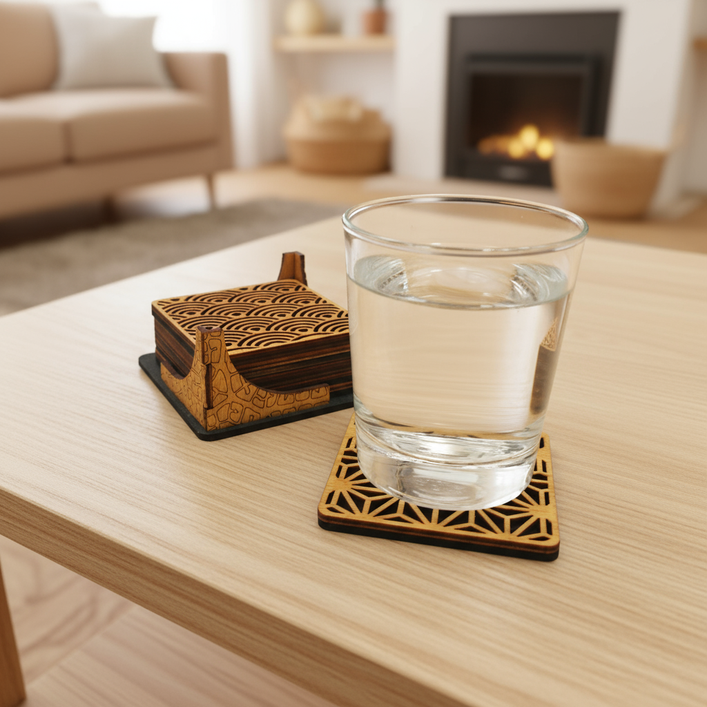 Το “Pattern Mix” είναι μια συλλογή έξι μοναδικών σχεδίων που συνδυάζουν γεωμετρία, συμμετρία και φυσική κομψότητα. Κάθε σουβέρ αποτελείται από δύο επίπεδα ξύλου: ένα μαύρο φόντο που αναδεικνύει το σχέδιο και ένα κομμένο laser πάνω layer, βαμμένο με βερνίκι σε απόχρωση Δρυς. Το αποτέλεσμα είναι ένα εντυπωσιακό παιχνίδι φωτός και αντίθεσης που τραβάει το βλέμμα.