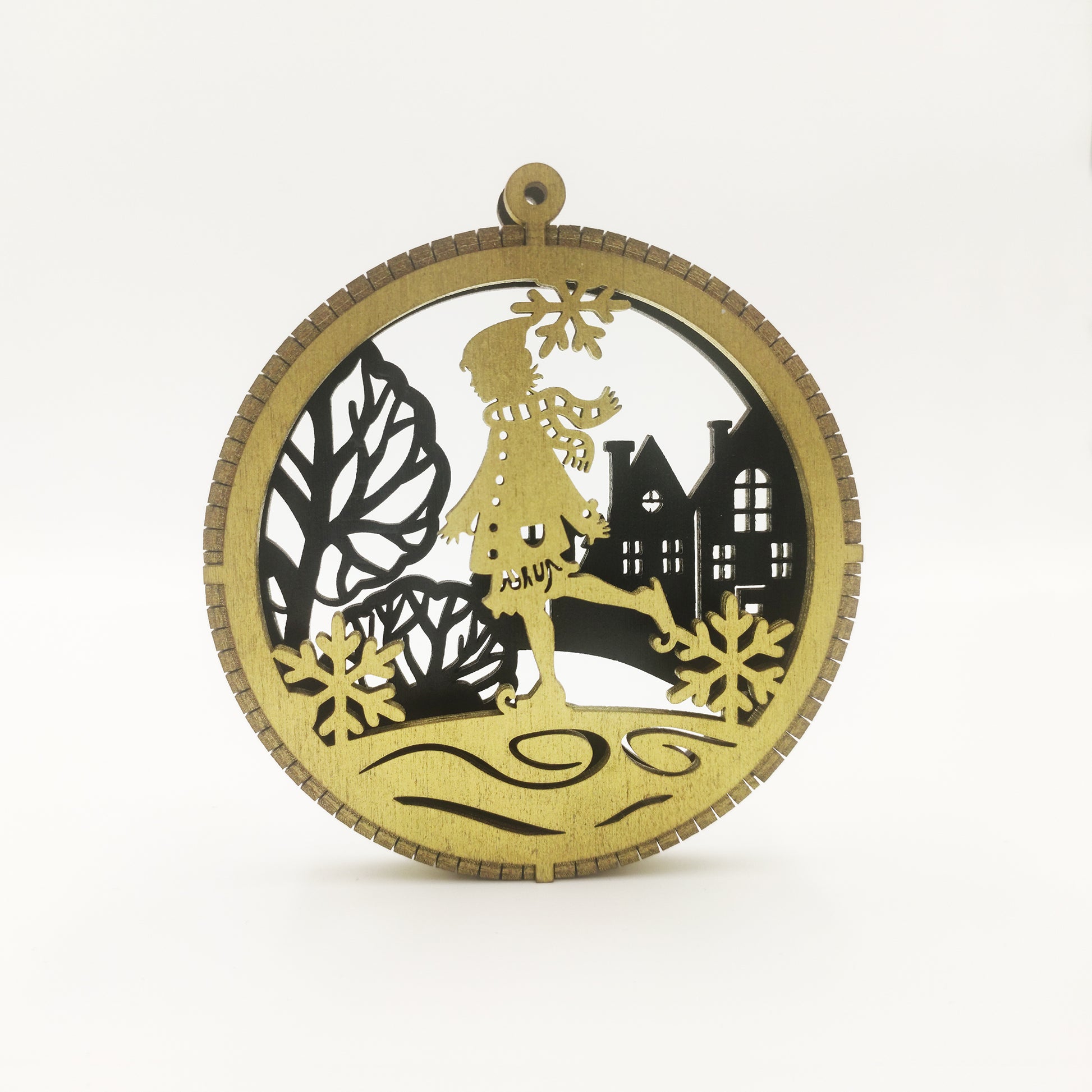 - Κοριτσάκι στον πάγο: Ένα χαρούμενο σκηνικό με ένα κοριτσάκι που κάνει πατινάζ, περιτριγυρισμένο από δέντρα και ένα χειμωνιάτικο χωριό.